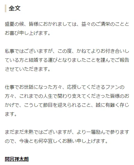 間宮さんは2024年7月、かねてより交際していた一般女性との結婚を自身の公式サイトで発表されました。